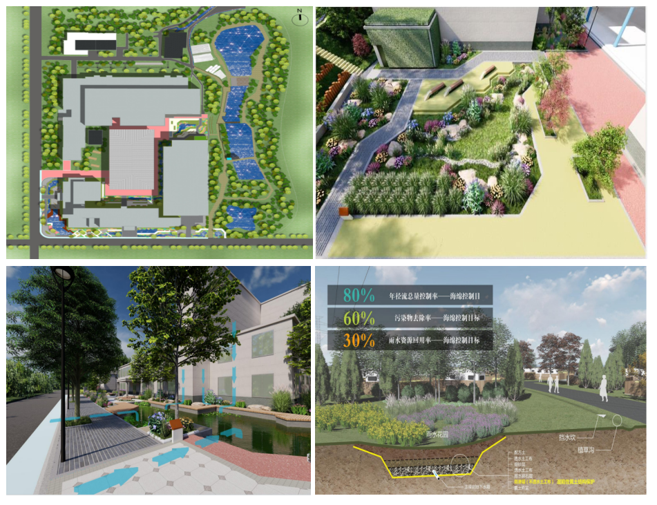 設計內容:,廠區道路綜合運用路緣石開口、下沉式綠地、透水鋪裝、蓄水滲水池等工程措施,有效控制雨水徑流。實現場地年徑流總量控制率80%的目標。