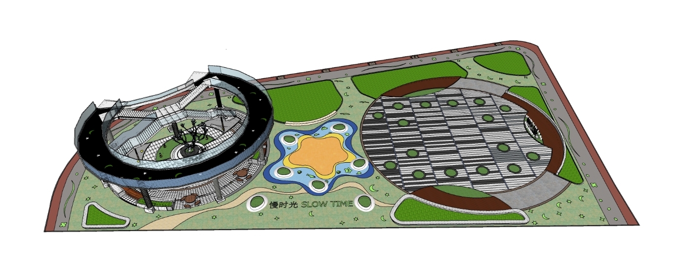 設計內容:游園主要通過下沉式綠地、植草溝、雨水花園、透水鋪裝等海綿措施。