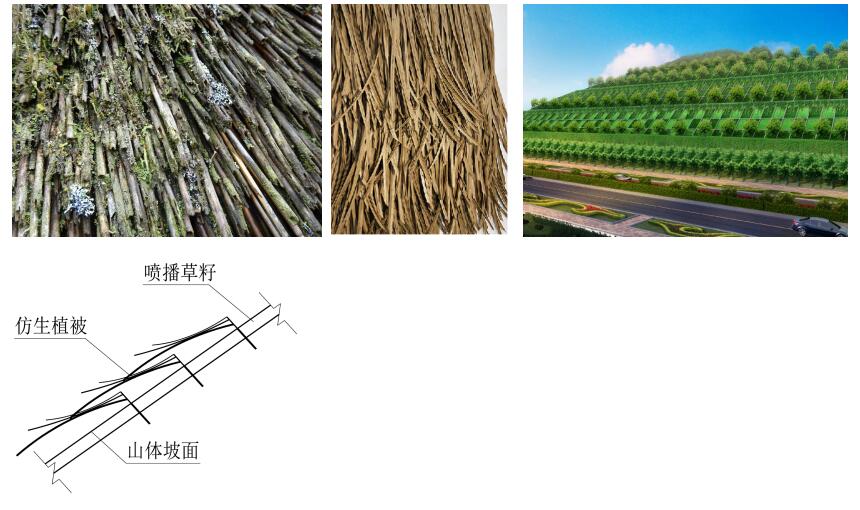 仿生植被生態(tài)護(hù)坡,運(yùn)用仿生植被板,通過錨釘及鋼網(wǎng)固定于山體坡面,仿照山體原生態(tài)植被,對(duì)山體坡面形成仿生態(tài)的保護(hù)層,有效避免了暴雨對(duì)坡面的侵蝕沖刷,并且材料的縫隙可存蓄雨水,對(duì)水土的涵養(yǎng),和植被的恢復(fù)有明顯作用。